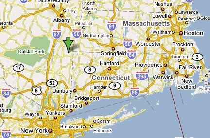 Take the MASS PIKE west to Exit 2, LEE, MA exit. Follow MA 102-W to Route 7. In Stockbridge, take a Left onto South St/US 7. In Great Barrington, Route 7 will come to a T intersection, take a left to stay on Route 7. After traveling through Great Barrington, take a right onto MA-23. Follow 23 past Catamount ski area into NY. Take a Left on Yonderview Road. Merge Left onto Route 22 South. Turn Right onto CR-3. In Ancramdale turn right onto Route 82 and follow up hill. Turn Left onto Skyline Road. Pop's Cabin will be on the right approximately .7 miles up Skyline Road.